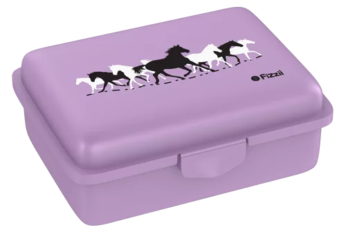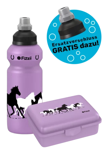 Fizzii Set "Haustier Pferd" bestehend aus einer 500ml Kindertrinkflasche "Pferd flieder", der passenden Snackbox "Pferd mint" mit herausnehmbarer Trennfachschale für Obst&Gemüse und einem zusätzlichen Drehtrinkverschluss in der Farbe schwarz/silber.